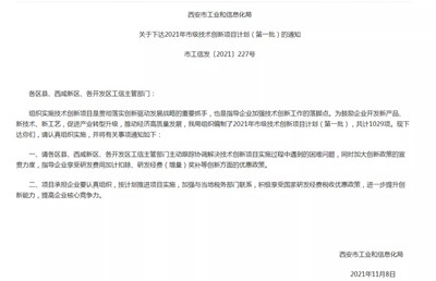 近日,西安市工業(yè)和信息化局公布了2021年市級(jí)技術(shù)創(chuàng)新項(xiàng)目名單。
